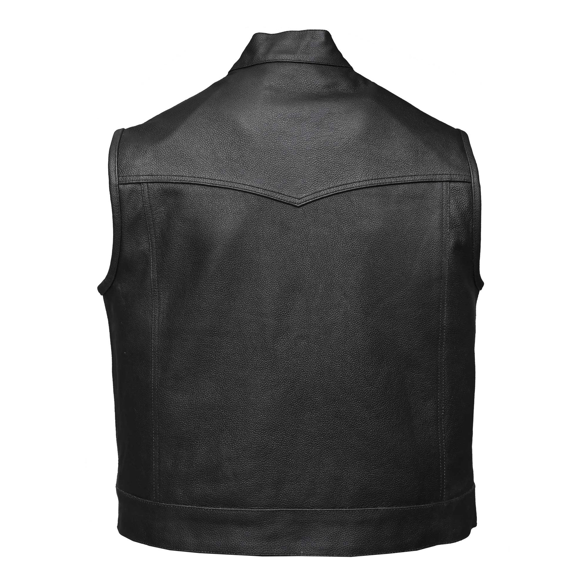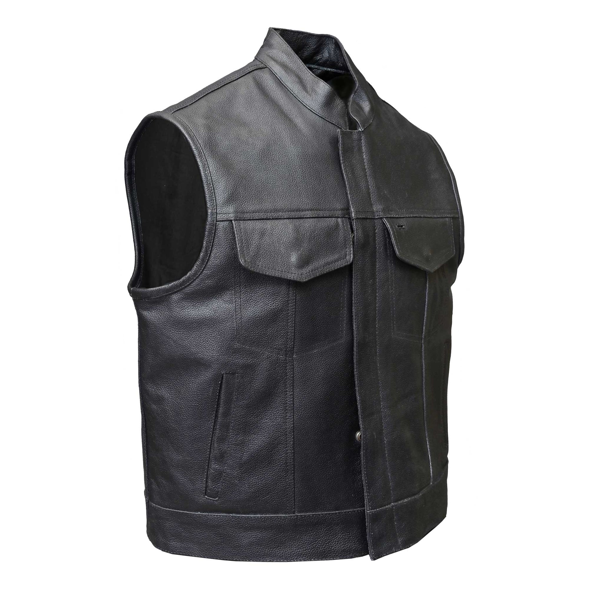 MC Leather Vest made of black split cowhide. Three pockets inside the lining, 1 large with zipper + 1 large with button + 1 small tobacco pocket. Zipper + snap button closure under front panel.